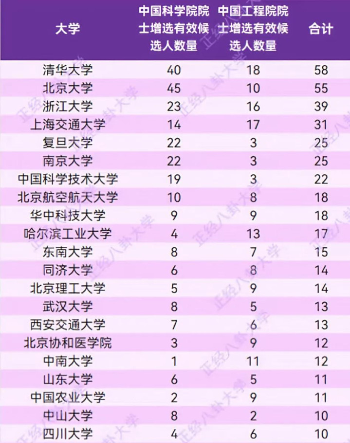 而从第10名的哈工大到第21名的川大,则大部分是工程院院士的候选人更多。